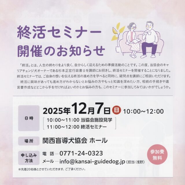 亀岡市にあります、関西盲導犬協会様にて「終活セミナー」の講師として参加させていただきます。