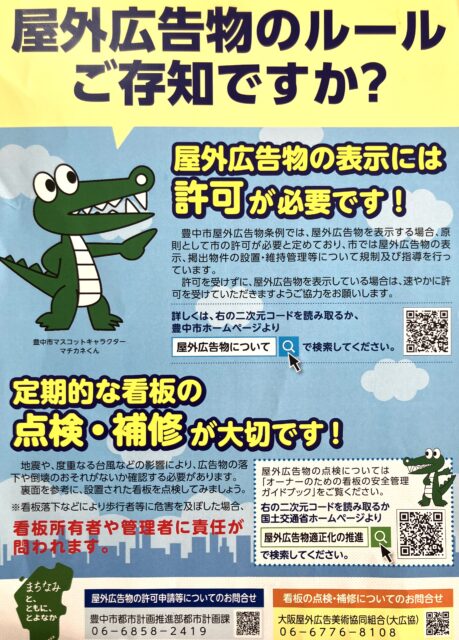 設置したい場所を管轄している自治体(都道府県、または市の景観条例がある場合は市)の屋外広告物条例を確認します。(豊中市は都市計画推進部都市計画課になります/下記にチラシを添付しています)