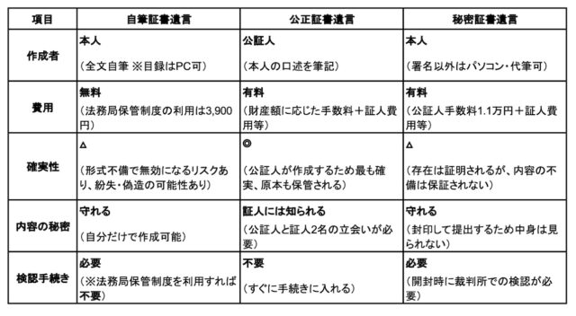 3つの種類を紹介しましたが、基本的には「自筆証書遺言」か「公正証書遺言」のどちらかを選ぶのが一般的です。